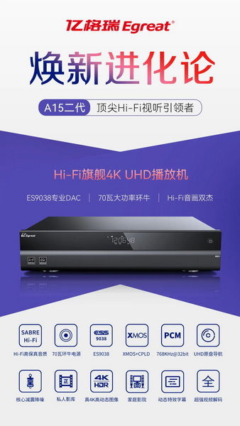 億格瑞藍光導航播放器的系列產品,曾多次在《家庭影院技術》與影音中國測評中表現優異。畫質通透、音質飽滿、操控順滑,在用戶的家庭影音娛樂生活中性能穩定,深受信賴!獨特功能優勢包括:家庭影院UHD原盤導航、私人影庫、全自動分類海報墻、4K高動態圖像,強視頻解碼和無損音樂播放,自定義LED顯示屏,動態特效字幕等等,為用戶高清還原影音精彩!