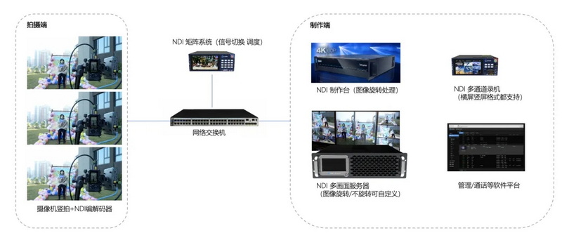 前端多機位攝像機正常橫屏拍攝,轉換為NDI IP信號進入后端NDI切換臺。用于豎屏制作的NDI切換臺,可對橫屏信號進行裁切后生成多路豎屏素材,經(jīng)過切換包裝后輸出豎屏PGM信號。而用于橫屏制作的NDI切換臺,則可直接利用橫屏信號源進行制作包裝,輸出橫屏PGM信號。系統(tǒng)中NDI矩陣、NDI多畫面系統(tǒng)、NDI多通道錄機等,都支持豎屏/橫屏信號的處理。該方案要求前端拍攝采用4K拍攝,這樣通過后端裁切后才可保證是1080P高清PGM信號。顯然這個裁切方案的優(yōu)勢是可支持橫豎同屏制作,滿足演播室大屏/小屏一起播出的業(yè)務需求,但是對現(xiàn)場負責拍攝和豎屏裁切構圖的老師提出更高的要求。